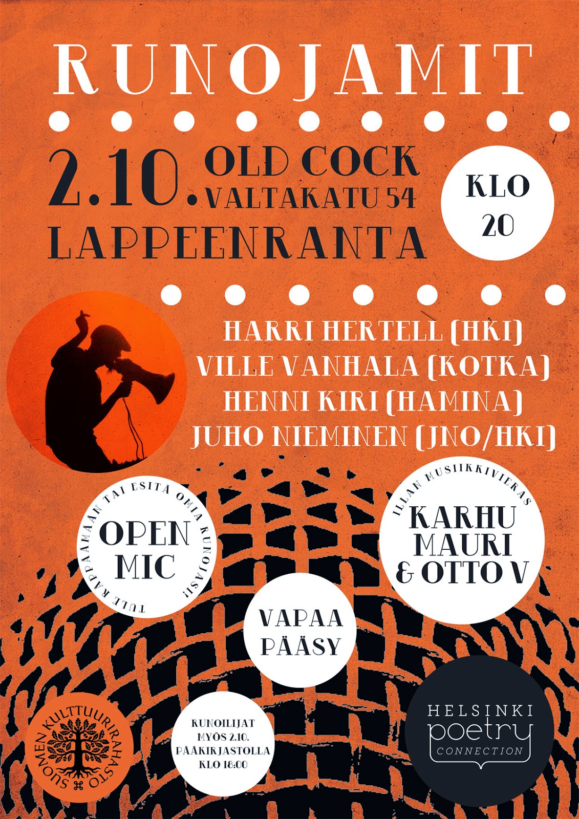 PS. Myöhemmin syksyllä Runojamit järjestetään myös Imatralla. Aikataulusta ja esiintyjistä ilmoitetaan myöhemmin.