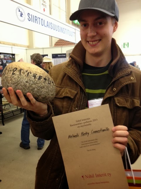 Nihil Interit ry:n Runoteko-palkinto on myönnetty Helsinki Poetry Connection -kollektiiville kokonaisuudessaan. Palkinto jaettiin Turun kansainvälisillä kirjamessuilla 4.10.2013, ja sen ottivat vastaan HPC:n hallituksesta varapuheenjohtaja Lasse Hauerwaas, puheenjohtaja Harri Hertell, jäsen Jarkko Jokinen sekä toiminnanjohtaja Kasper Salonen. Palkinto on runoilija J.K. Ihalaisen tekemä päältä kullattu kivinen trofee-esine (ks. kuva alla!). Nihil Interit -runojärjestö perusti sekä Runoteko- että Runoteos-palkintonsa 20-vuotisjuhlavuotensa kunniaksi, eli palkinnot jaettin tänä vuonna ensimmäistä kertaa. Runoteos-palkinnon voitti myös Poetry Jam -klubilla esiintynyt runoilija Anja Erämaja Töölönlahti-kokoelmallaan. Lue lisää.