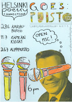 The HPC’s yearly outdoor poetry club will open the gate of summer poetry haps wide open in Karhupuisto, in the district of Kallio in Helsinki. Join us on Friday the 28th at 6pm for delicious coffee stand goodies, hopefully awesome weather and some bona fide stage poetry. Don’t forget to bring your own poems or other material, because after our three warm-up performers (Jarkko Jokinen, Sampo Sihvola and Lasse Hauerwaas) it’s OPEN MIC time! Hojo!