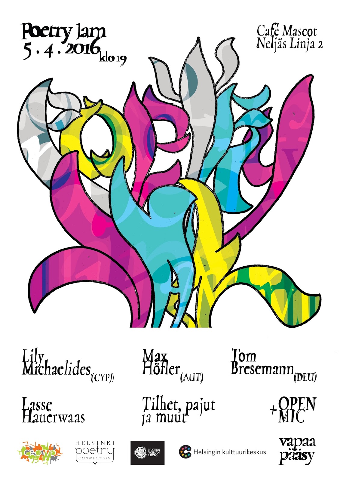 The Poetry Jam is organized by the Helsinki Poetry Connection and Nuoren Voiman Liitto, with the kind aid of the Helsinki City Cultural Center and, of course, all our wonderful supporters from January’s crowdfunding success. Entry free of charge! Welcome!