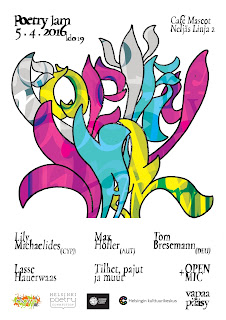 Kulttisuosittu Poetry Jam -sanataideklubi jatkaa kevään ohjelmistoaan Cafe Mascotissa (Neljäs linja 2) poikkeuksellisesti tiistaina 5.4. alkaen klo 19. Luvassa on jälleen monipuolinen ilta runouden ja lyriikan parissa, tällä kertaa erikoisella kansainvälisellä kattauksella!