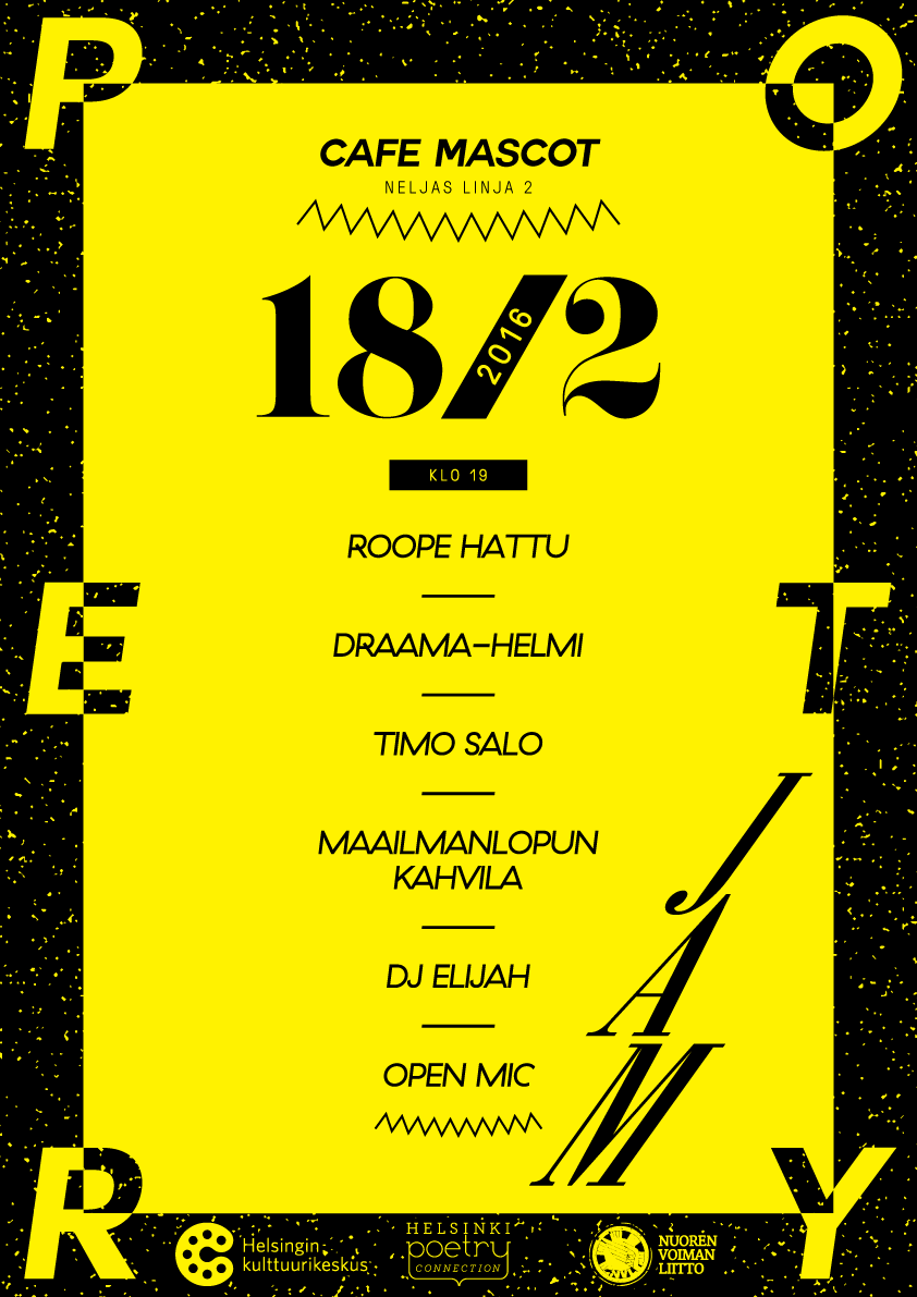 Helsinki Poetry Connection toivottaa kaikki nykykulttuurista ja etenkin lavarunoudesta kiinnostuneet tervetulleiksi saapumaan Kallion Cafe Mascotiin (Neljäs linja 2) torstaina 18.2.2016, sillä sanat ovat jälleen Poetry Jam -kultti-illan keskiössä.