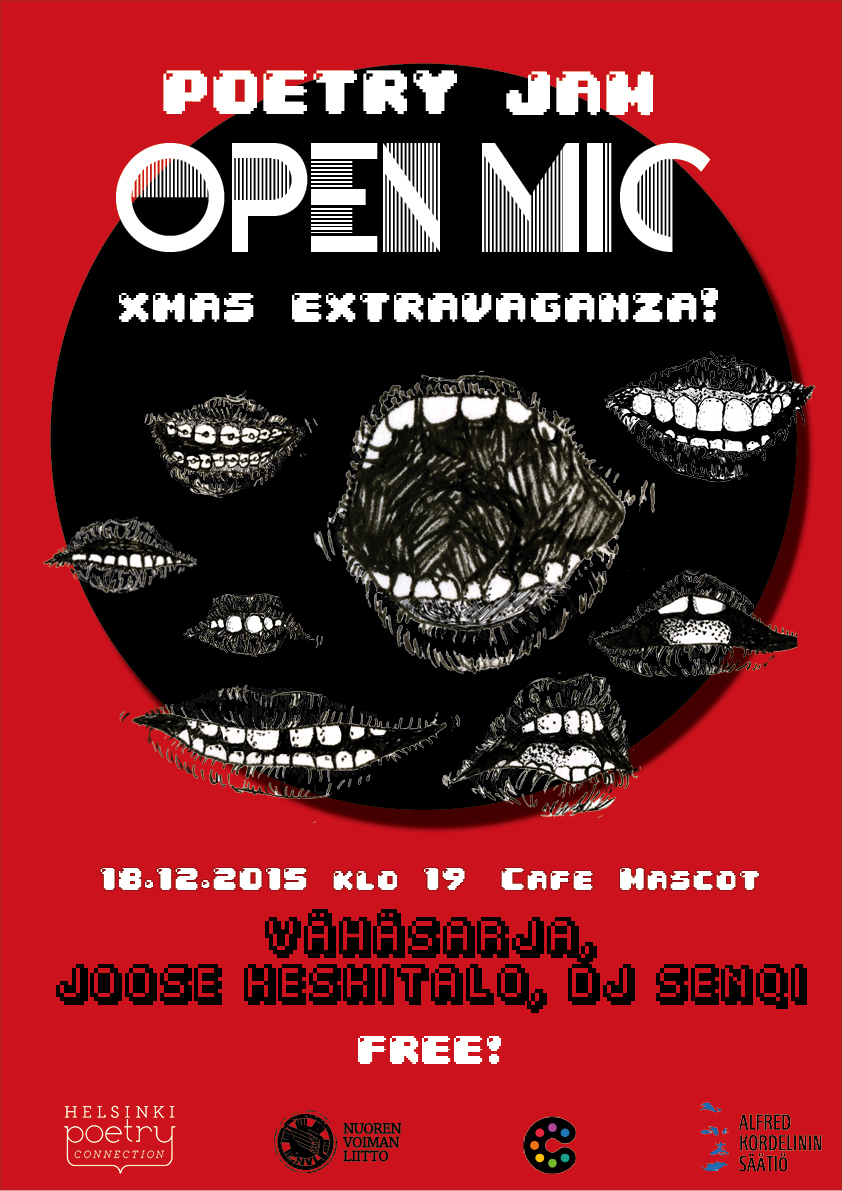 On Friday, December 18 we bring you our Poetry Jam open mic extravaganza! That means that all you poets, writers, rappers, out-loud-thinkers, singers, word tinkerers, sound wizards, storytellers, comedians, and artists of all stripes will be given a chance to perform your own original work at Cafe Mascot (Neljäs linja 2) on a rarely seen scale.